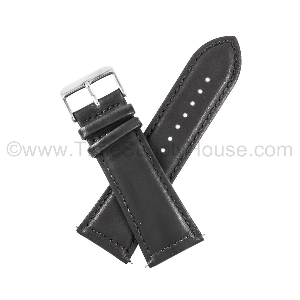 A genuine leather calfskin grain with stitching strap, standard length, silver-tone polish finish stainless steel buckle, leather lining, slightly tapered cut and reinforced stitching around the band.