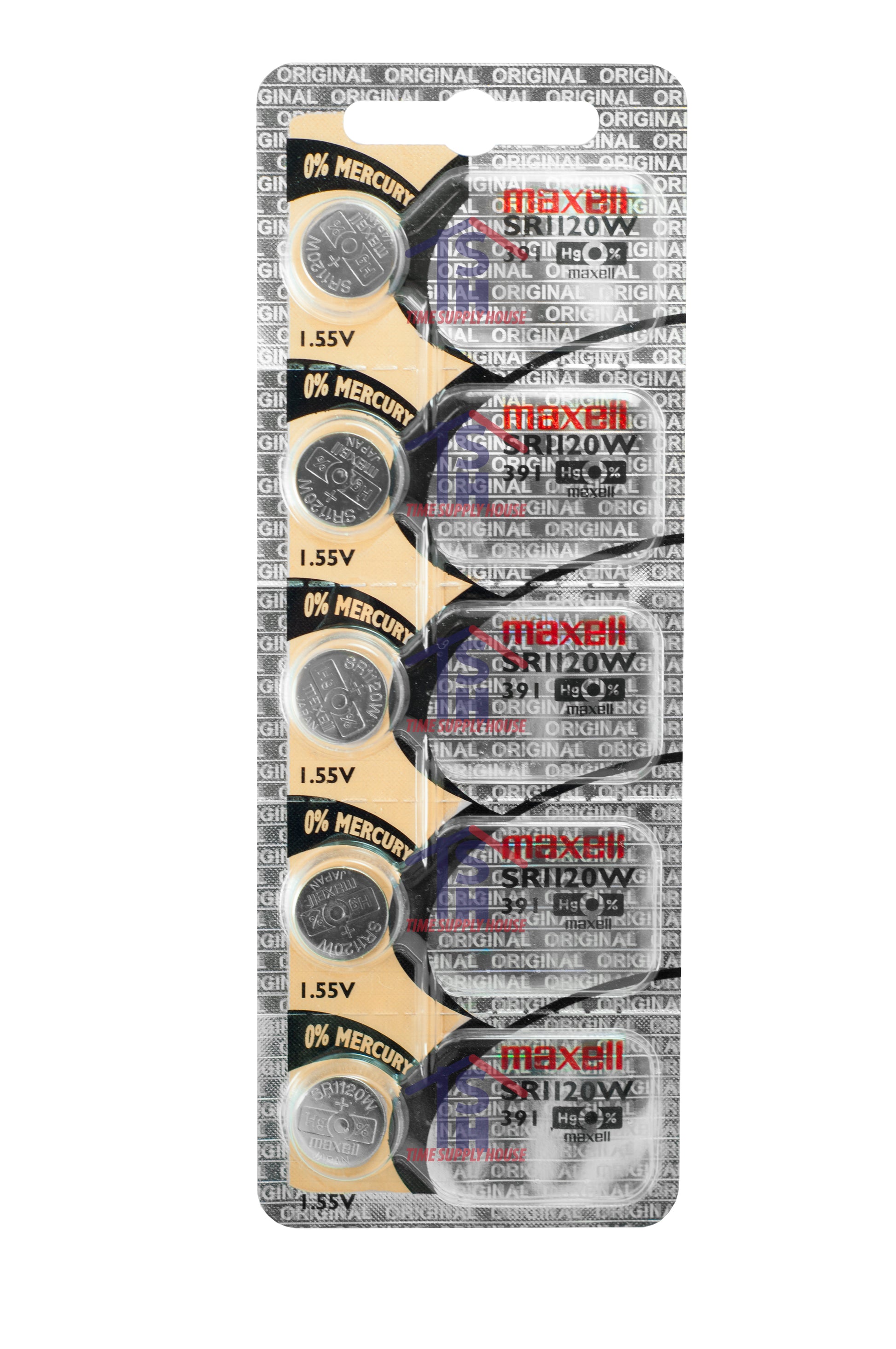 Maxell Silver Oxide Watch Battery SR1120W High Drain Replaces 391 This battery is a Silver-Oxide cell normally used in watches, with a shelf life of 5+ years. Other applications may include calculators, film cameras, medical instruments, cash registers, or FA instruments (measuring instruments, onboard microcomputers, sensors). This is a “W” high drain battery. High Drain batteries are for applications with a continuous, low power consumption and occasional high peaks: Analog and digital watches with extra functions (backlight, alarm), pocket calculators, electronic games, cameras, etc. This is in comparison to low drain batteries, which are best used in devices that use a small amount of power over a long time: Analog watches, TV remotes, alarm clocks, etc. Specifications Chemistry: Silver Oxide Voltage: 1.55V Diameter: 11.6 mm Height: 2.05 mm Features High Drain – Best used with multi-function watches incorporating an alarm, illumination light, etc. A flat discharge curve during discharge supplies a stable voltage until the end of the discharge life High-energy density per unit volume provides 2x the amount of energy capacity as button-type alkaline batteries Featuring Maxell’s original leak-resistant processing Also Known As: 10 L 130/D 391, 1160SO, 191, 191-1, 280-27, 280-30, 317, 381, 391, 391A, 399, 553, 609, AG8, D191, D391, G8A, GP391, KA55, L, L1121, LR1120, LR1121, LR4230, LR55, LR927W, R 381/34, R 391/23, RW 300, RW 40, S1121S, SB-AS/DS, SB-BS/ES, SB-DS/AS, SG8, SP391, SR 1120 SW, SR 1120 W, SR 55, SR1120SW, SR1120W, SR1120W/SW, SR1121, SR55, SR57, SR927W, V381, V391